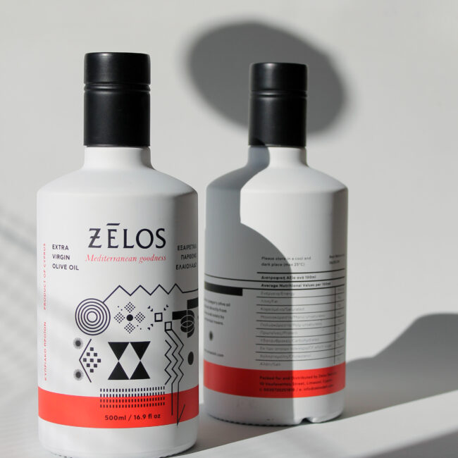 ZĒLOS is a company producing premium olive products from the mountains of Cyprus, active for the past five years both locally and abroad. The client requested a redesign of the packaging and renewal of the corporate identity, including the choice of bottle, printing, and packaging methods. Although a premium look was not initially requested, the new design elevated the product’s image, opening new business opportunities through the strong collaboration between designer and client.